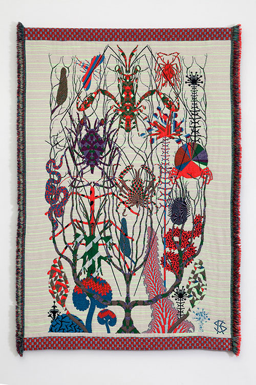 Saksi crea tapices con la técnica de tejido Jacquard . Los textiles han sido elaborados con lana de angora y alpaca, algodón y materiales sintéticos, como fosfato e hilos acrílicos de metal. El conjunto, marcadamente surrealista, hace referencia al estado de confusión sensorial que se produce en las fases intermedias entre el sueño y la vigilia, denominado alucinación hipnopómpica. Durante estos momentos, en ocasiones, se pueden tener percepciones visuales aparentemente reales que no lo son y que con frecuencia refieren a animales como arañas, monos e insectos, y otras criaturas. Los paisajes de Saksi, de formas orgánicas y colores vivos, crean un mundo multi-sensorial y psicodélico.
